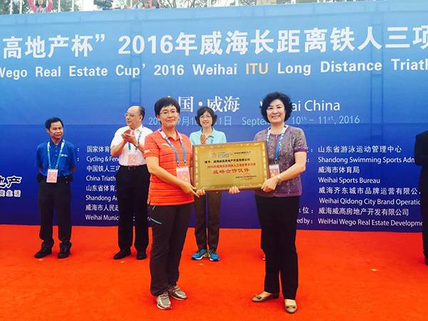 由威高地产冠名的“威高地产杯”2016年度威海长距离铁人三项赛,9月11日圆满落幕。本次大赛共有来自世界各地的1000多名选手同场竞技,为威海及全国观众奉上了一场高水平体育盛宴,也进一步提升了威海产业经济发展和城市宜居品牌形象。威高集团副总裁、威高地产集团董事长周淑华出席开幕式,威高地产集团总经理姜明出席闭幕式并为获奖远动员颁奖。威高地产集团同时获得威海市重大体育赛事组委会颁发的“2016年威海长距离铁人三项世界系列赛”战略合作伙伴荣誉。
