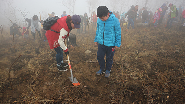 到达山顶后,经过里口山工作人员的技巧讲解之后,植树活动正式开始。挖坑,将小树苗放入坑中,埋土,踩实……大家分工协作,把一道道工序安排得井井有条,不一会功夫,800棵小树苗就全部种植完毕。“我种了12棵树,”7岁的小朋友昊昊兴奋地说道,“等明年的时候,我要跟爸爸妈妈一起来看我们种的树。”