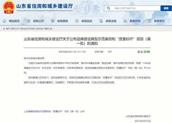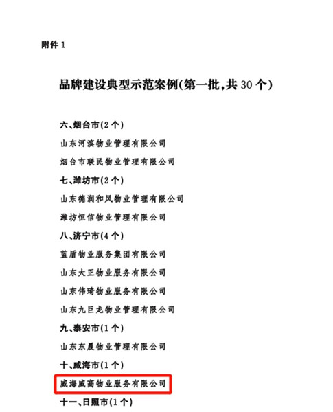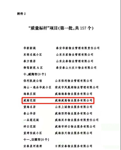 近日,山东省住房和城乡建设厅发布《关于公布品牌建设典型示范案例和“质量标杆”项目(第一批)的通知》,经初审推荐、专家审核等程序,威海威高物业服务有限公司入选全省首批品牌建设典型示范案例,威高花园入选全省首批“质量标杆”项目。