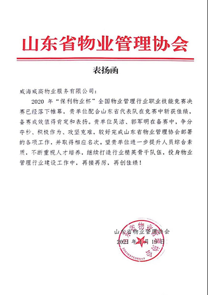 4月20日,山东省物业管理协会代表莅临威海,为威海威高物业服务有限公司授予表扬函以及会员证书,对威高物业员工吴洁、郭军明在2020年“保利物业杯”全国行业管理职业技能竞赛中的表现给予肯定,与此同时,对威高物业在今后的人员综合素质以及人才培养方面寄予厚望。