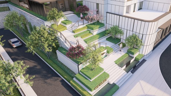 入门处,是记忆台阶与型景墙的营造,拾级而上,两侧婆娑乔木萦绕,营造“打开”的空间氛围,随着礼仪连廊,更添一份静谧,至锦绣亭处,核心客厅,多层序列绿篱豁然开朗,一卷闲书,一盏禅茶,与嘉兰共葳蕤,与桂华同皎洁。