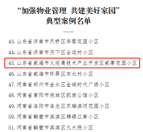 近日,中华人民共和国住房和城乡建设部、中央文明办公布100个“加强物业管理 共建美好家园”典型案例,山东省威海市威高花园小区榜上有名,名列山东省仅有的4个小区之列。