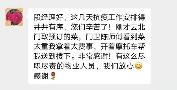 在业主群中,众多疫情消息中间夹着一条业主的感谢语,原来是业主居家隔离订菜较多,润和花园秩序维护陈涛看到后主动骑车将业主送到楼下,小小的举动却让业主的心中倍感温暖。