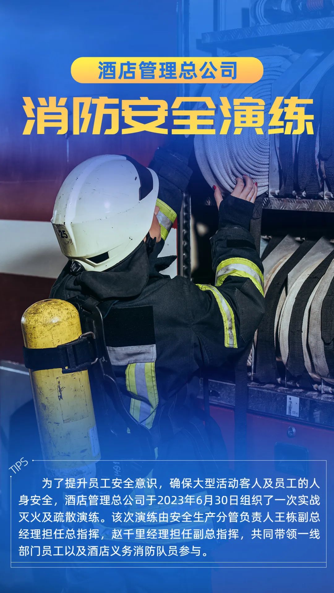 酒店属于人员密集场所,如果疏于防范,极易发生火灾等重大安全事故。通过消防演练,在酒店内部形成统一领导、反应及时、科学决策、处置有序的消防应急系统,可以有效全面提升酒店应对火灾事故能力,增强整体自防自救能力,切实保障客人的生命和财产安全。