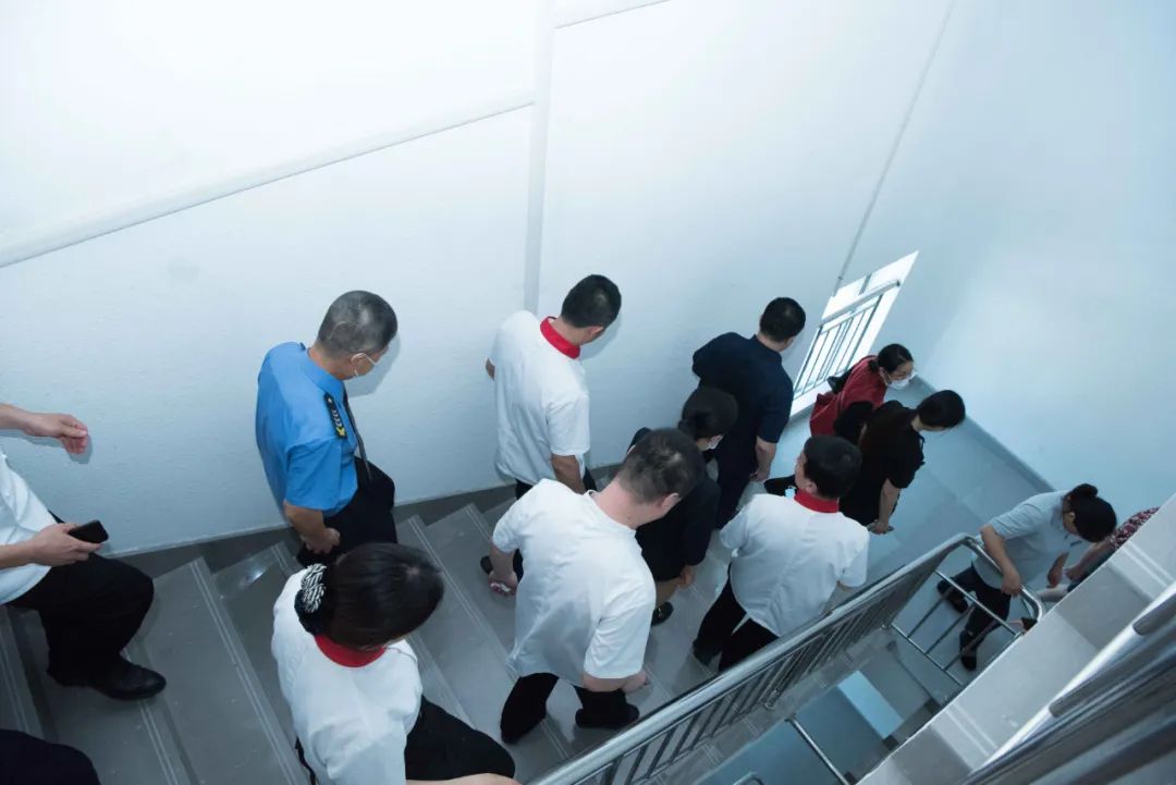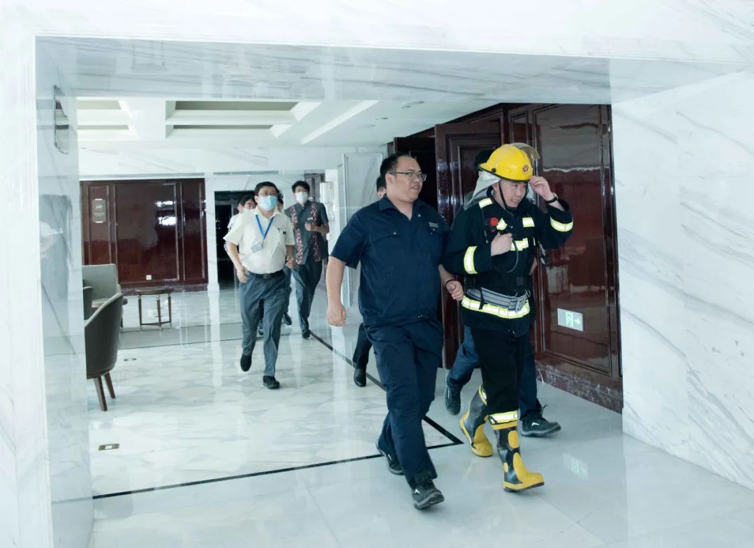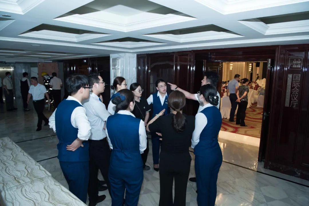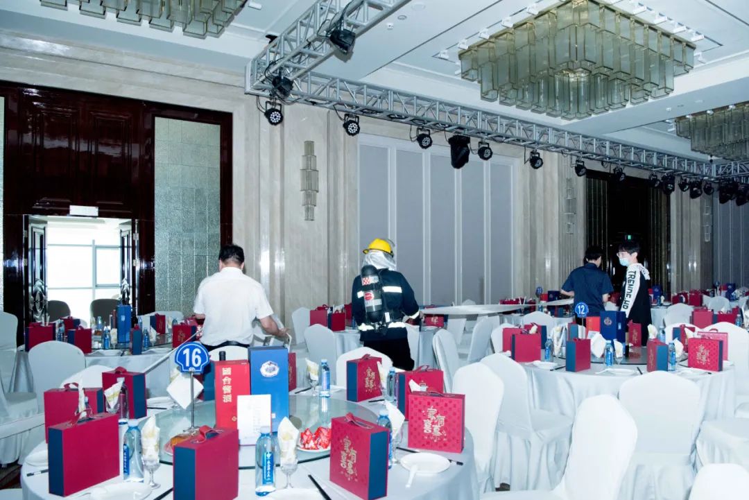 本次消防演练以酒店婚宴和会议场所突发“火情”警报为序幕,员工扮演被困的客人,酒店安全部员工全员待命。一旦火情警报发出,消防中心立即通过对讲机通知火情处置组对现场火势进行控制,同时疏散指挥组负责引导客人就近从安全通道疏散,保证疏散秩序井然有序。