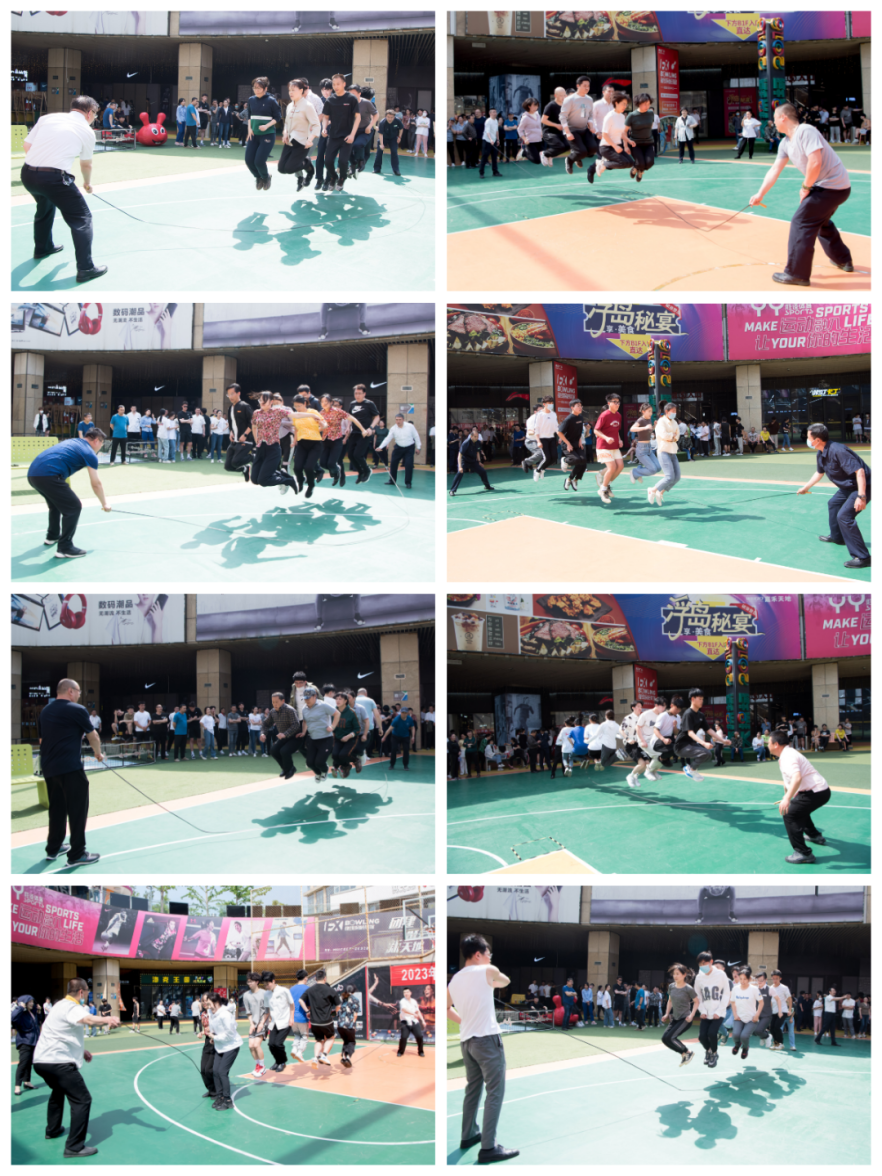 首先进行的是集体跳绳比赛,每组跳绳4男4女,比赛根据各队跳的次数多少来决定胜负。比赛中,队员们通过默契配合和实力展示了出色的跳绳技巧,现场气氛十分热烈。