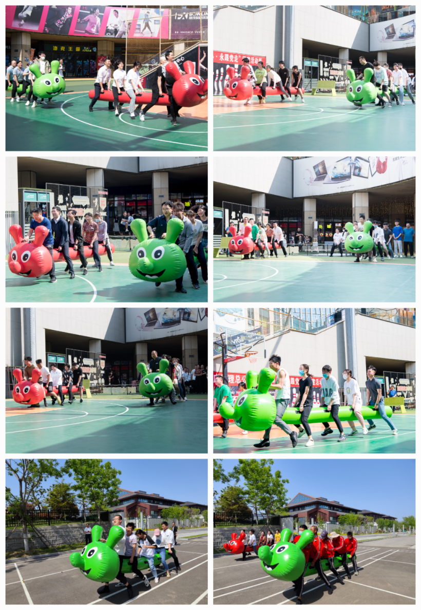 其次进行的是竞速毛毛虫比赛,每组由3男2女组成,分别完成一段段的奔跑和互相拼接,最终用时最短者胜出。比赛中,每个队员都充分发挥了自己的优势,各显神通,真实体现了团队协作的力量。