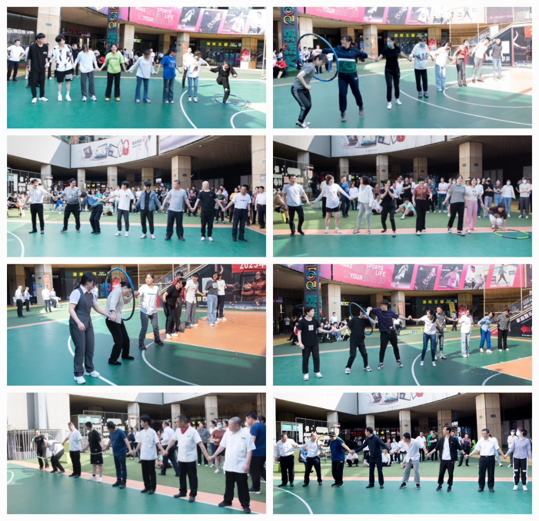 最后进行的项目是一圈到底比赛,每个团队需通过灵活的肢体动作和协作配合,将呼啦圈顺序传递至队伍末尾。用时最短的团队获胜。比赛中,各组队员通过灵活多变的技巧和紧密的配合,积极争取以最短的时间完成呼啦圈的传递。