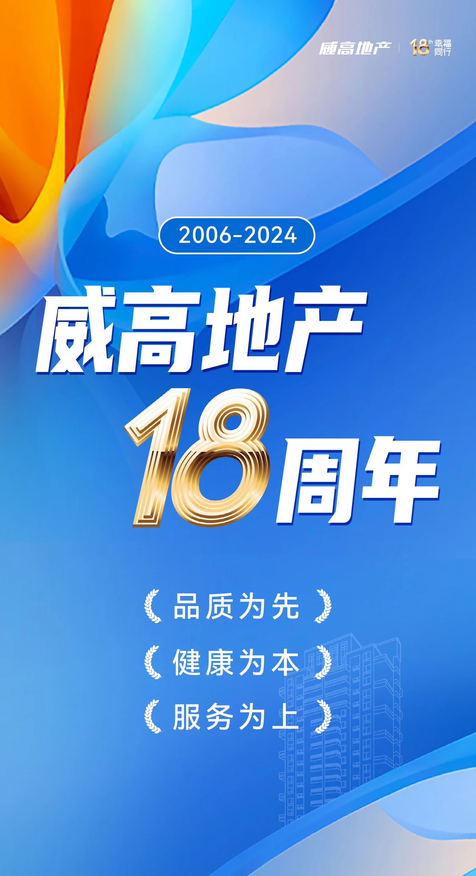 2006-2024,威高地产迎来第18周年。一路走来,威高地产持续聚合城市与集团资源,赋能城市发展建设,开发19盘,建设7座城市地标,将远见与美好融入城市格局。